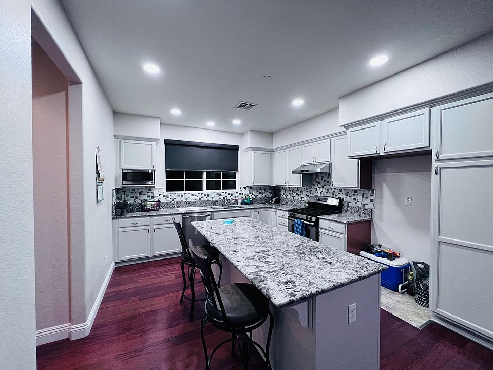 Gorgeous Semi Furnished Condo in Ardenwood located in highly rated school area. The property is a three storied condo with total 1701 sq. ft. It's a fully upgraded house recently with hardwood throughout, bathrooms upgraded (total 3.5 baths), new paint throughout, two zone nest thermostat. The property offers total three bedrooms with each having attached bathroom. Following are some highlights describing property features: Primary master bedroom is fully furnished includes - CA king bed - Projector with Apple TV and Bose sound system - Big master bath with walking closet - Closet is fully furnished with lot of storage space - Standing shower and big shower tub Other two bedrooms have furnished closets Kitchen includes all appliances required with big island with high chairs - Washer and dryer included - All windows covered with blinds / curtains - Ceiling lights throughout - Includes water and electricity (electricity is covered up to $100) - Attached two car garage with 240v EV car charge and lot of storage space - One shared computer desk with cabinets on the top - Living room includes TV, TV stand, Bose 5.1 channel sound system, sofa - 1/2 half bath shared Deposit is due at singing. No smoking allowed. Washer and dryer included in the house. Refrigerator, gas range and dishwasher are provided. Piano visible in the picture is not included. Lease terms are flexible.