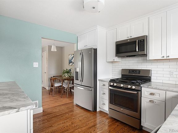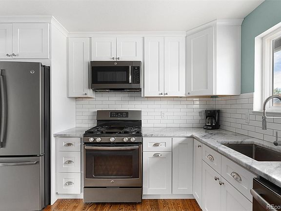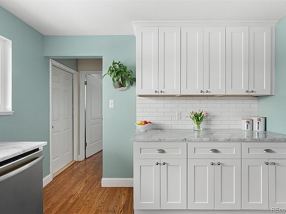 This remodeled 4 bedroom/2 bathroom ranch home with a 2-car garage has been fully updated from top to bottom, inside and out with both mountain and city views! Centrally located in Lakewood with a short 10-minute drive to downtown, Red Rocks, Highlands and more with easy access to the light rail, I-25, I-70, and 6th Ave. On the main floor you will find gorgeous, refinished floors throughout, a living room with large windows, kitchen, dining nook, 3 bedrooms, and an updated full bathroom. The kitchen has been renovated and upgraded with quartzite countertops, cabinets with soft close drawers (trash and recycling built-in too), tile backsplash, stainless steel appliances, and crown molding. The bathrooms have also been completely updated with new sinks, a tub in the upstairs bath, toilets, and custom tile to the ceiling in both. The refinished basement boasts a second living space, a conforming bedroom with custom built-in cabinets/closet space, a 3/4 bath, laundry with cabinets and butcher block counters + utility room, and storage space. Additionally, this home has all new interior doors and hardware, canned lighting, ceiling fans, textured walls and ceilings, baseboard trim, and paint throughout! Outback is a large, private, fully fenced-in backyard with newer stain, a patio area, chicken coop, storage shed, and greenhouse. Sprinklers, sod, and concrete driveway were added in 2020. To top it off, this home also has a new roof and gutters (2023), attic insulation added (2020), electric panel (2020), furnace/HVAC (2020), hot water heater (2017), and all new windows (2016). Many neighbors open enroll to nearby Dennison elementary and Jeff Open. Just minutes down the street from Belmar where you can enjoy local dining, shopping, Target, and Whole Foods. Enjoy the plethora of nearby parks - Sloans Lake, Red Rocks, Wash Park, Bear Creek Park and more. This home is truly turn key with a convenient location and ready for you to make it your new home!