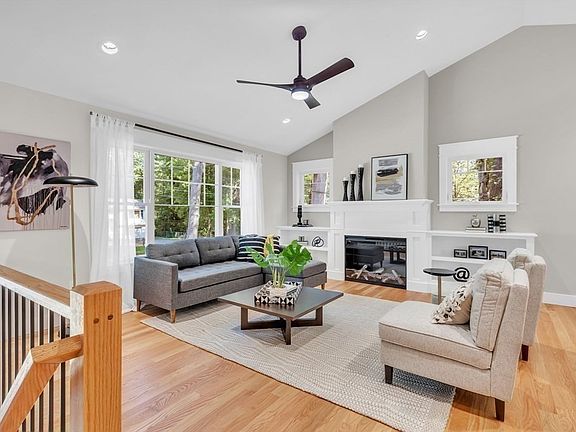 NEW CONSTRUCTION CONTEMPORARY COLONIAL FOUR BEDROOMS & THREE BATHS. OPEN FLOOR PLAN living room, dining area and WHITE KITCHEN. Center island, quartz counters, backsplash, s/s appliances in a fabulous space with vaulted ceilings, hw floors, fp with custom built-in's, decorative metal railings, recessed lighting and a slider to the deck. This level has a primary bedroom with an en-suite bath with a tiled shower, two additional bedrooms, full bath with tile and a laundry closet. Entry level with high ceilings, luxury vinyl plank flooring, bedroom, bath and flexible space with a slider could be an office or getaway space. Two car garage. Low VOC paint and active radon system. This home is fossil fuel free to support Northampton's carbon neutral goal. (596a & 596b Ryan Rd is a condo association with the common driveway as shared element, both single family homes will be for the exclusive use of the respective owners, subject to by-laws and rules & regulations). JUST MOVE IN!