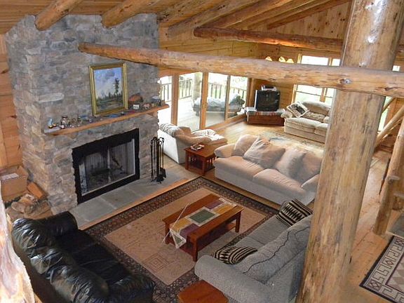 With a gorgeous Great Room with cathedral ceiling, floor to ceiling stone fireplace, sliding doors looking out to the lake, this log home sits on a waterfront parcel that is all sand beach, has good title and year round road access. The floor plan includes 2 bedrooms, and 2 lofts, 1 full bath, living dining and kitchen plus TV area. A full, walkout basement offers additional living space, if desired. The views toward Blue Mountain are superb.