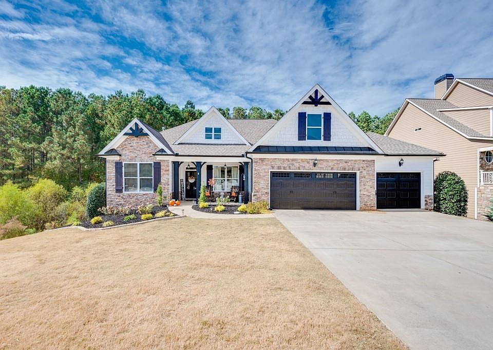 Come fall in love with this beautiful Craftsman RANCH home on a full basement! Enjoy one level living in this open & spacious home featuring upscale details including hardwood flooring throughout main areas, granite countertops; crown molding; 8ft tall craftsman doors; tongue and groove ceiling on front and back porch; tray ceiling in primary; and coffered ceilings in living room and dining room. Enjoy a stacked stone fireplace with a raised hearth to warm up those winter nights. The oversized primary bedroom w/ spa like bath features a soaking tub and separate tiled shower, granite counter tops, private water closet, walk in closet opens to convenient Laundry Room. Three ample sized bedrooms and two full baths are on the opposite side of the home and you will find the 5th bedroom located on the terrace level, perfect for guests, office or media room. The large unfinished area of basement is ready for your personalization and stubbed for a bath. Enjoy your favorite beverages and fun gatherings on the screened in porch, open air deck and newly constructed oversized secondary deck overlooking a private fenced in newly sodded back yard. Property backs up to green space for extra privacy. You will be thrilled with the large 3 car garage for all your vehicles and "toys" in this golf cart friendly community. Seller just had entire exterior of home painted and over $20K of fresh landscaping and outdoor areas updated. The Hills at Chestnut Grove is a desirable neighborhood in East Paulding with a large playground, private, sparkling neighborhood pool and picnic pavilion area. Convenient to parks, restaurants, shopping and great schools.