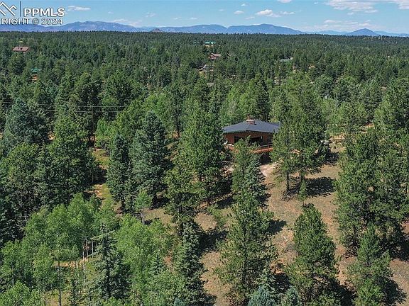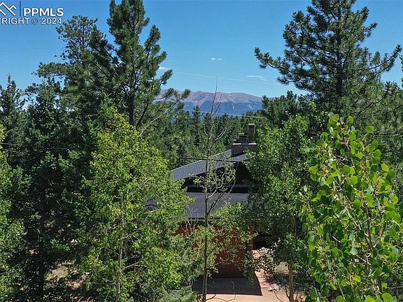 This charming mountain chalet in Spring Valley offers a peaceful retreat nestled among a lush treed setting. The welcoming main floor exudes a bright and airy ambiance, complete with a vaulted ceiling adorned with beamed tongue and groove ceilings. A lovely fireplace with a custom stone hearth adds cozy charm, while the large bright windows frame stunning Pikes Peak views and bask the space in welcoming southern exposure. Convenience is key with a bedroom and bath on the main floor, providing easy access. Step out onto the wrap around deck, perfect for al fresco dining and entertaining, while enjoying the panoramic views and scenic vista. Descend to the lower level family room, which boasts floor-to-ceiling windows that beautifully capture the natural surroundings. Two additional bedrooms and another bathroom offer comfort and privacy. The main floor features new wood flooring, adding a touch of elegance to the space. The semi-attached oversized one-car garage provides ample storage and convenience. With plenty of room for RV parking, this property is ideal for outdoor enthusiasts. Located in a Teller County gem, the neighborhood features a large lake, offering abundant opportunities for recreation and relaxation. This mountain chalet truly offers a perfect blend of comfort, convenience, and natural beauty, making it a desirable retreat for those seeking a serene mountain lifestyle.