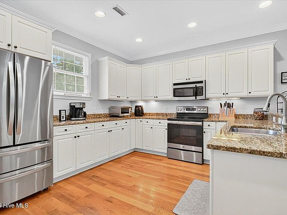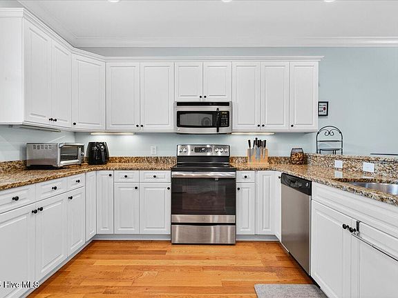 Highly sought after 4 bedroom, 3.5 bath, 2200 sq ft luxury townhome in stunning and amenity-rich Rivers Edge Golf Community. Features include a private oceanfront Holden Beach clubhouse, indoor outdoor pools, huge fitness center, sauna, hot tub, pickleball and tennis! This townhome has it all...hardwood floors on the main level, multiple porches to sit back and relax, a patio for grilling, two oversized en suite bedrooms on separate levels, a large kitchen with ample storage, pantry, counter space, and seating for all your guests. The great room makes entertaining easy and comfortable. Off the living room is both a porch and an office nook. The lower level with patio access and en suite bedroom can easily be a private space for in-laws or the adult children who never move out! The third level boasts two guests bedrooms, one with a private balcony, a guest bath, laundry, and the primary en suite with a walk-in closet.