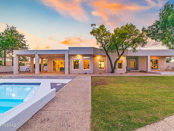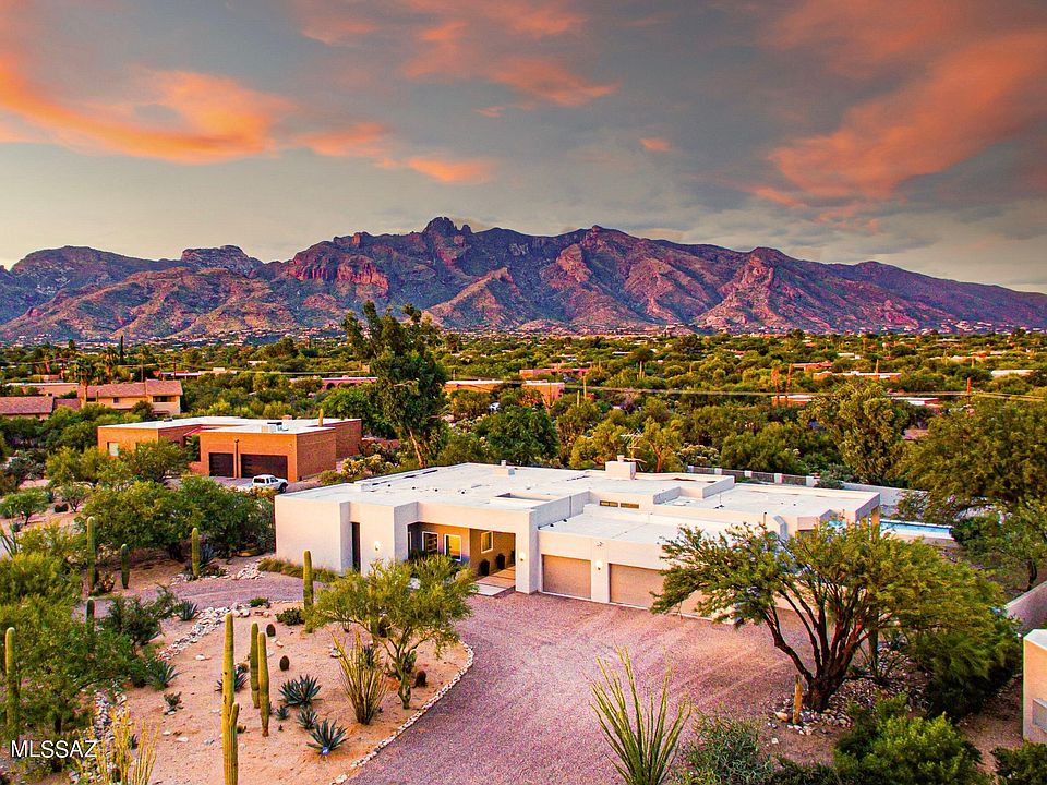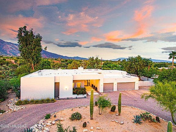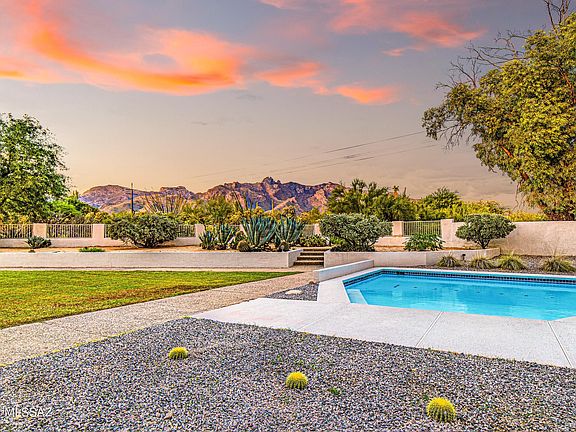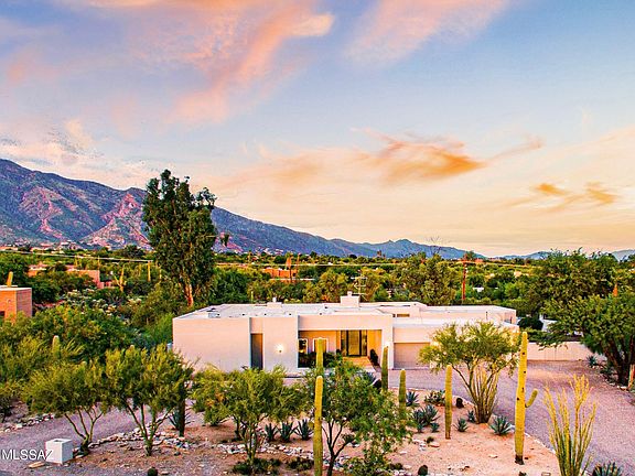 Stunning modern home located in the heart of the Catalina Foothills. Enjoy unbelievable mountain views from huge 0.8 acre lot. Enter through a circular driveway & dramatic front entry. Perfect open floor plan w/ kitchen opening up to dining & great room. 3 Bedrooms, 3 full bathrooms, office, plus 2 flex spaces (1 currently used as play room). Sleek modern kitchen w/ white flat cabinetry, quartz countertops & stainless steel appliances. Bar area off kitchen w/ beverage fridge is perfect for entertaining. Wood floors throughout. Master bdrm is perfectly appointed w/ accent wall & sitting area. Spacious & private backyard with real grass, large pool, & optimal sun orientation. Amazing location- District 16 & close to Tucson's best shopping & dining!