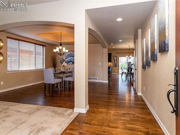 Welcome home to this very well maintained, popular Classic Home’s Summit floor plan priced under current appraisal. A covered front porch with mountain views invites you in to the open floor plan with spacious living and dining room area. The gourmet kitchen is the heart of this home. Plenty of cabinets, over and under cabinet lighting, pantry, large island with storage, granite countertops and custom tile backsplash along with stainless steel appliances. Imagine entertaining friends and family while everyone enjoys the stone fireplace and view of the beautifully landscaped backyard with large patio. Upstairs, the sizable owner’s suite features an upgraded 5-piece bath with double vanity, custom tile shower and soaking tub and a large walk in closet. There are also two big additional bedrooms that both feature walk in closets as well as a large loft area. The basement is ready for parties with a rough in for a future wet bar in the family game area and an additional bedroom and full size bathroom. Too many upgrades to list but highlights include professionally landscaped yard front and back, whole house humidifier, sprinkler system, central air, window well covers, ceiling fans, surround sound wiring, finished 3 car garage and large laundry room with cabinets. This home needs nothing, is well maintained and thoughtfully upgraded and is ideally situated in the very popular Wolf Ranch community surrounded by award winning District 20 schools with close proximity to shopping, dining, and the best of Northern Colorado Springs. See it today and gain instant equity.