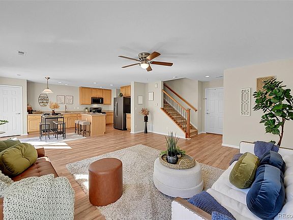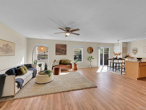 Exceptionally well cared for and updated 3 bedroom, 3 bathroom paired home in popular Castlewood Ranch. An attractive covered front porch welcomes you into this inviting townhome. New carpet and new paint offer a total refresh. The open floor plan showcases lots of natural light with a layout that flows from living room to dining area and on to the kitchen with a center island, fingerprint resistant stainless steel appliances, pantry, and ample storage cabinets with pull-out shelving. From the dining area the sliding door leads out to the lovely patio and private fenced-in backyard with landscaping. Fence newly restained. This amazing location backs to a greenbelt. Near a large open space with a walking path and Mitchell Gulch Park. Upstairs you will find the beautiful large primary bedroom with adjoining full bathroom suite and walk in closet, two additional bedrooms and a second full bathroom. A conveniently located laundry area can be found upstairs near the bedrooms. The attached 2-car garage is fully finished and has built-in cabinets for extra storage. The furnace was replaced in 2022, AC replaced in 2023, hot water heater replaced 2020. A new roof and exterior paint are currently scheduled through the HOA. Related special assessment fees have already been paid by the Seller. Located near parks, schools, shopping, dining, outdoor recreation, and minutes to downtown Castle Rock. This wonderful home is in a prime location, it's move-in ready, and a great opportunity. Come check it out!