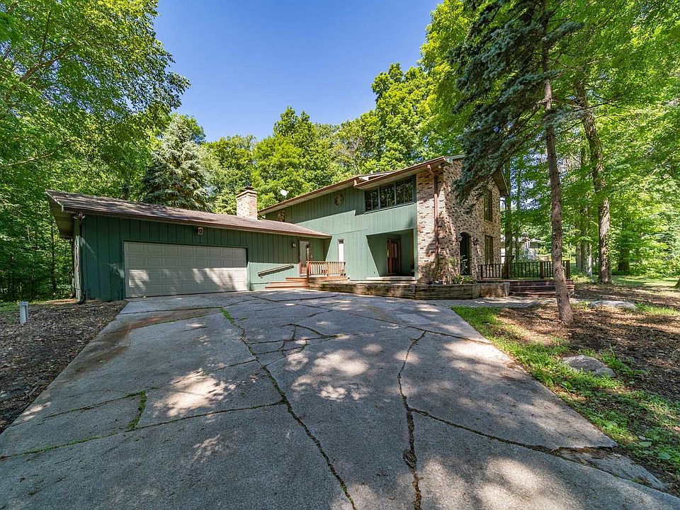 WOW! 8.46 acres in Penn Schools! This large home is waiting for its next family to love. Space everywhere! Spacious living and dining room combination. Cozy den with fireplace on the main floor. Updated kitchen with granite countertops. Main floor bedroom with attached bath has handicap accessible private entrance. This room over looks the wooded lot. Could also be used for a home office. Covered front porch would be perfect for summer night dinners. Upstairs you will find 4 large bedrooms. Owner's suite has an attached bath and a private screen porch. Finished lower level with bar and stone fireplace. Lots of storage space and laundry room. Don't miss the outbuilding at the front of the property. Its larger than it looks!! Grab the family-its time to settle in the house in the trees.