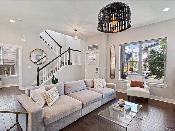 Luxurious finishes abound in this stunning 4 bedroom, 3.5 bath immaculate home with a finished basement and 2-car attached garage in Central Park’s Beeler Park neighborhood. Just blocks from Splash Landing Pool, Shops at Beeler, the soon to open Pearl Market, this beautifully curated home welcomes you in with a quintessential porch swing, ready for afternoons of relaxing the day’s cares away. The main floor begins the home’s impressive greeting with high ceilings, warm wood floors and a thoughtful open floor plan. An elegant living room beckons you with a cozy fireplace and gorgeous lighting. The idyllic kitchen rests at the heart of the living and dining rooms, destined to be where loved ones come to gather around the large white quartz island. Bright and stylish with white subway and soft-close white & grey tuxedo cabinetry, this chef’s kitchen offers all the essentials including stainless steel appliances, a 5-burner gas range & hood, wall oven and pantry. The dining room boasts elegant trim and a 8-light chandelier. Follow the glass door outside for a perfect dining al fresco option on the extended paver patio and low maintenance pet-grade turf yard. A mudroom and powder bath round out the main level. Make your way upstairs to the primary retreat with a 5-pc ensuite bathroom with *heated floors* ready to warm you right up! The suite’s 12-foot walk-in closet will be the envy of all your friends! Two additional bedrooms, a laundry closet with included washer/dryer, as well as a full hall bath complete the second floor. The finished basement includes a spacious family/media room with built-in speakers, a workout space, an additional large bedroom and a full bathroom. With beautiful finishes and the perfect neutral color scheme - there's no work left to do! With miles of hiking and biking trails as well as the green open spaces of Rocky Mountain Wildlife Refuge, come enjoy the best Colorado has to offer! Quick commute to Downtown, DIA, and Anschutz Medical Complex!