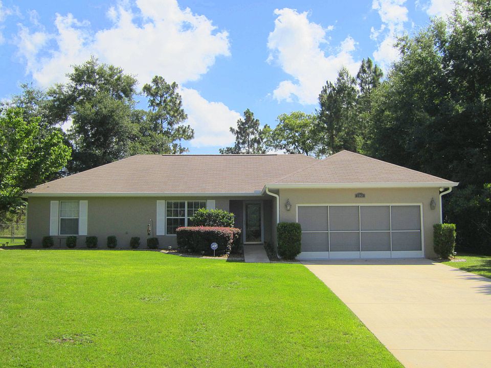 Well kept home in Marion Oaks North backs up to greenway. Fenced yard. Quality storm door, Tile, vinyl and carpeted floors, laundry with sink and washer and dryer. French doors with blinds to the enclosed lanai that can be enjoyed year round. Garage has side pedestrian door and screen. Gutters and downspouts. Move in condition.