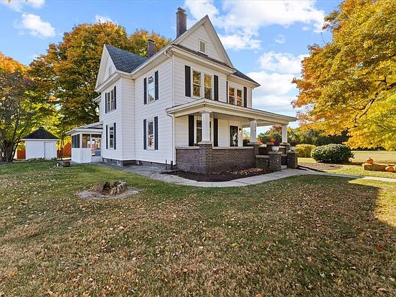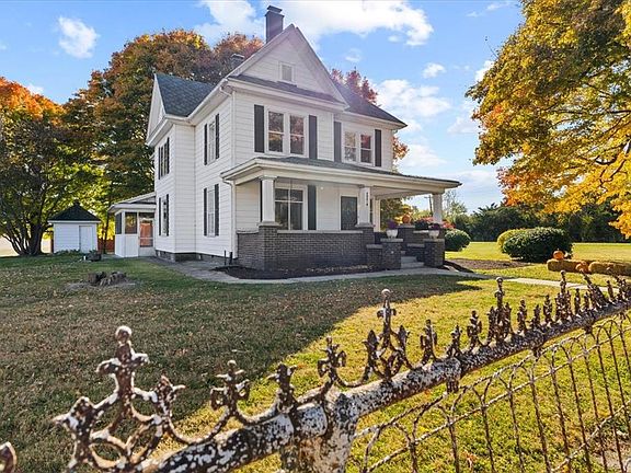 Iconic Farmhouse that you do not want to miss. This property has been in the same family for 151 years. Enter the front door from the porch, that beautifully connects the outdoors to the indoors. A porch that provides the residents with a place to relax in the shade. Ceilings-1st floor 9ft, 2nd floor 8ft, Attic floor 7.5ft, Beds 5, Baths-1 full&2 half baths. Hardwood flooring! Extra Tall Baseboard trim! 1980’s updated 17x13 kitchen still in pristine shape with lazy Suzan, plenty of cabinet space and pull-out cutting board. Oversized bedrooms with notable walk in closets. 4 Amish Built outbuildings ranging 53x42, 41x30, 25x20, & 22x14. New concrete flooring in each with power, insulated garage doors, and metal wrapped. Mins from I-74E/465