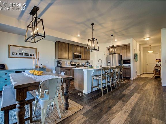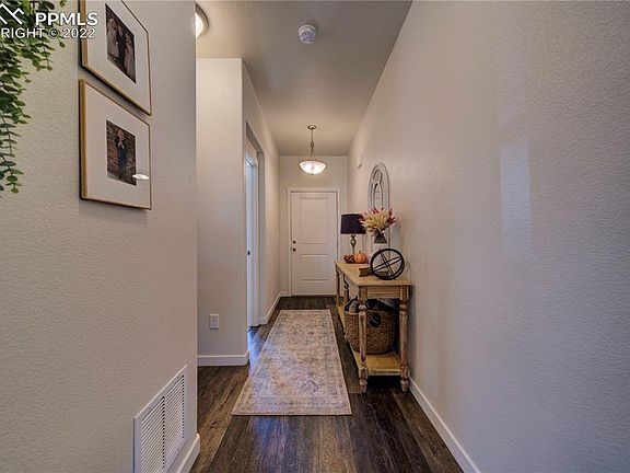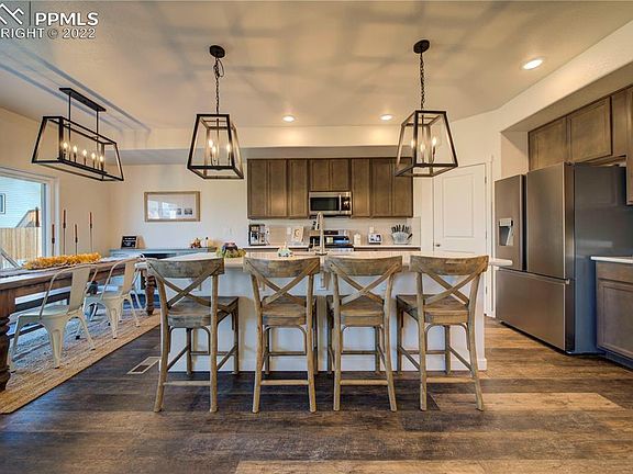 Welcome to this move in ready home that features 5 bedrooms, 3 bathrooms, upgrades galore and best of all, sits on 1/4-acre lot. Home was built in 2021 in Lorson Ranch by Aspen View and is the Danby floorplan. This gorgeous home boasts with pride, is well maintained and cared for. As you enter, you are welcomed with Luxury Vinyl Planks throughout the entry, kitchen and dining area. Kitchen features beautiful quartz countertops, gas stove, oversize pantry and a wonderful 9x4 ft kitchen island. Kitchen fixtures have also been upgraded with an amazing chandelier and with light fixtures above the island to match, Moen faucet with sprayer, a large single bowl sink and kitchen tile backsplash to tie it altogether. The kitchen is open to the living room that has a ceiling fan and is spacious enough for plenty of seating. Main level also has a bedroom with full bathroom and access to the garage. Moving on upstairs, that's where you will find the remainder of the bedrooms, bathrooms and views. The master bedroom has a wood trimmed accent wall, ceiling fan, 4-piece bathroom and a walk-in closet. Master bathroom has a double vanity, quartz countertop, stand up shower with a poured pan and is surrounded by ceramic tile walls. For amazing convenience, laundry room is upstairs with a custom built in shelf. There you will also find the last bathroom with beautiful tile work and quartz countertop. The remainder 3 bedrooms are spacious and have great views of the lot. Upper level also features a loft that is great for a family room or an office and has views of Pikes Peak. Home includes AC, humidifier, 8ft garage door and 8lb pad Shaw Carpet. Lastly, you cannot miss the oversized back yard! It has a 10x12 ft patio, with a grassy area and zero scaping that surrounds the home. Close to schools, shopping, Fort Carson and Peterson. Come see today and call it your own!