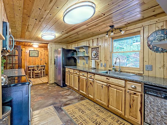 Welcome to historic Wolffork Valley, a breathtaking landscape surrounded by rolling mountain ranges. Once part of Cherokee territory, this valley and the larger Rabun Gap area served as a centuries-old travel corridor for Native Americans, explorers, and settlers. This inviting home combines mountain character with modern updates. The living room features a massive stone fireplace and exposed rough-sawn timber rafters, perfect for cozy evenings. The kitchen is equipped with stainless steel appliances, granite countertops, a breakfast nook, and a separate dining area overlooking the front of the home. The rustic outbuilding offers endless possibilities as an artist's studio, playhouse, or woodworking shop. A detached carport with additional storage provides plenty of space for gardening tools, outdoor gear, and more. Some furniture is negotiable