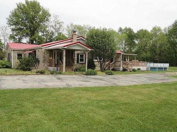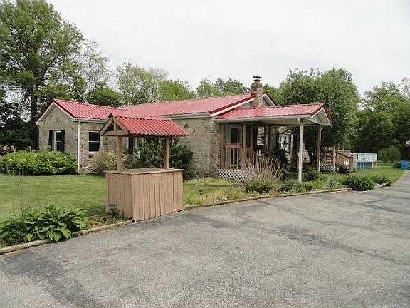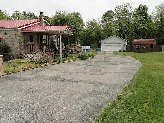 Home is a 4 bedroom, 1 bath, 1864 sq. ft. stone sided home that offers a huge living room with stone hearth for a wood burning stove plus an eat in kitchen. There is a small front porch, a large back deck with an above ground pool. A paved driveway leads up to a 2 -- car detached garage which is 22x40 that includes a nice sized storage room/workshop area. Another outbuilding sits next to the garage and is 10x14, all of this on 4 acres of nice open yard and some shade trees.