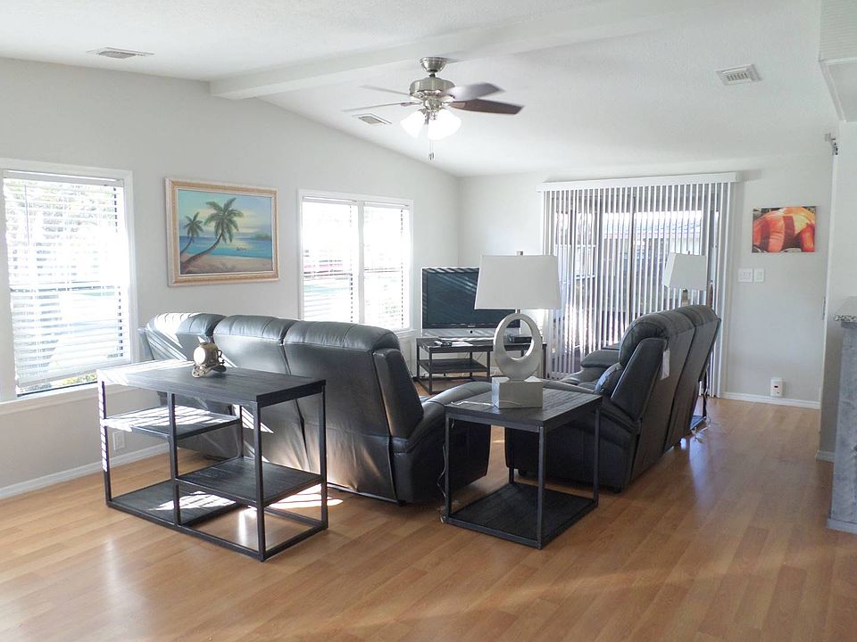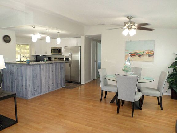 SUPER SPACIOUS, light bright and beautiful contemporary renovation is mostly furnished and is absolutely move-in ready. Seller is offering this home at a heck of a price to ensure a quick closing! This open concept floor plan includes a cathedral ceiling as you enter the home, spacious dining area and beautiful new kitchen with bar top island. There are 2 bedrooms and 2 baths, a large storage room which could easily be converted into an office, crafts room or indoor laundry, 200 sf enclosed porch and a private 14' x 17' deck. Some of the recent improvements and great features include: - Drywall, new molding and freshly painted - Laminate flooring throughout minus guest bedroom with new carpeting - Perfect kitchen for entertaining has new cabinets, 2018 stainless appliances, granite countertops and lighting - Baths updated with new vanities, granite countertops and lighting - Sliding barn door over built-in wall shelving - New white blinds throughout - New white outlets and wall switches - Both bedrooms, kitchen and enclosed porch are equipped with plug-ins for TV Antenna providing many channels - Master bedroom has attractive exterior plantation shutters for added privacy - Newer LG washer and dryer - Quality storm door and tiled step entry This home is furnished as pictured and includes some kitchenware and smaller appliances. HVAC is 2008 and serviced annually. New water heater 2015. Great curb appeal with attractive and easy care landscaping and on a friendly cul-de-sac! Camelot Lakes is a beautiful, gated, resort style 55+ community located just minutes from all of your shopping needs, I75 access, the white sand beaches of the Gulf of Mexico and fabulous downtown Sarasota. Monthly lot rent includes water, sewer, trash/recycling, lawn maintenance, taxes and all park amenities. Now you can afford a piece of paradise!