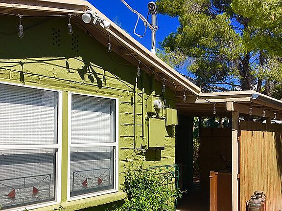 Price just reduced! Wonderful central location! Charming mid-century concrete block home situated far off the street. The large .20 acre lot offers privacy, mountain views and lots of possibilities. This affordable home has been well maintained and has kept its mid-century charm. The vintage style kitchen and bathroom offer quality cabinetry and elegant tile counters. Exquisite stained-glass door. Spacious living room/dining room. Spacious bedroom. Bonus room. Ceramic tile floors and new carpeting. Some updated windows and updated plumbing. Newer master cool and wall AC units keep the home cool. Relax under the covered patios and ramada. Numerous large storage sheds. Roof serviced by Hallmark Roofing and comes with a 3 year warranty.Please click on MORE section for owner's remarks.