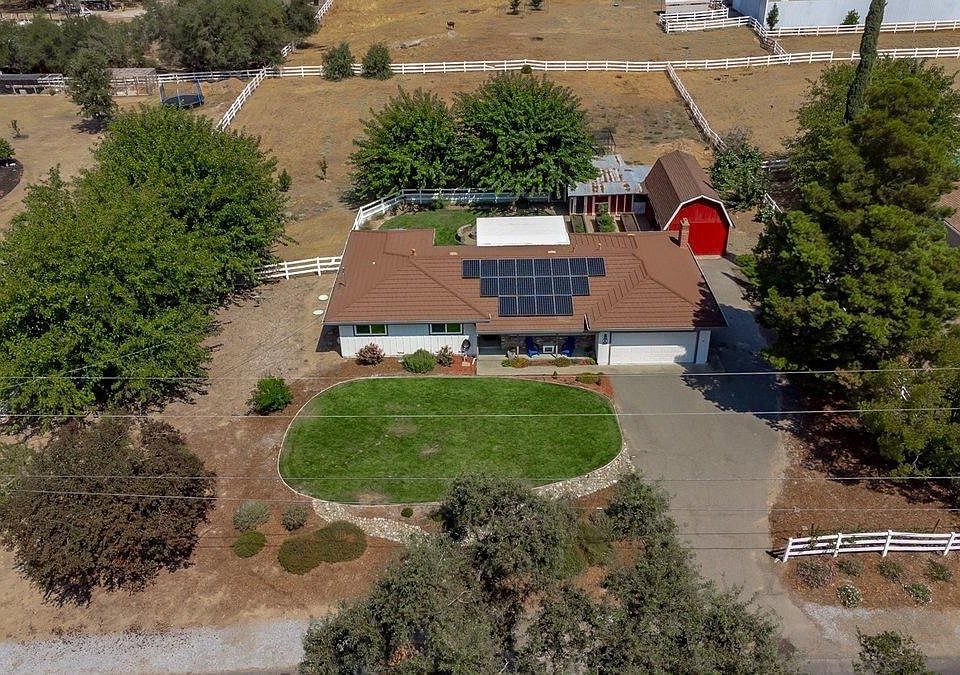 Beautiful Newly Remodeled, Ranch Style Home on Nearly 1 (0.998) Acre lot with New OWNED SOLAR. PERMITTED RED BARN has been updated 2023. RED Barn Could be Possible Future ADU. IMPECCABLY CLEAN INSIDE & OUT! Ready for your Family & Animals. Light & Bright Open Floor Plan has been Remodeled in 2020. Upgrades Include New Drywall, Interior Paint, Insulation, Trane HVAC, Whole House Fan, Vinyl Windows & Slider, Interior Doors, Baseboards, Luxury Vinyl Plank flooring, Custom White Shaker Cabinets With Pullouts & Hot Water Heater. Kitchen Has Granite Countertops, Stainless Steel Bosch Dual Fuel Range, Electric Convention Oven, Dishwasher & Stainless Steel LG Refrigerator. Spacious Primary Bedroom with Luxury Walk-in Closet with Organizers (former 4th Bedroom). Both Baths Remodeled. Newer Front Siding & Exterior Paint. EV Charger in Garage. Washer & Dryer Included. All New Concrete in Backyard, Patio Cover with Fans, Outdoor Sink & Hot Tub is Less than a year old. Fire Pit. All Raised Garden Beds are on Drip System. Additional Garden Beds Behind Barn has Water Reservoirs for Watering. Many Storage Areas In Garden area That is Part of the Barn & Can Be Used for Storage Rooms or for Chicken coop. Huge Back Pasture is Fenced. Tons of Fruit Trees.