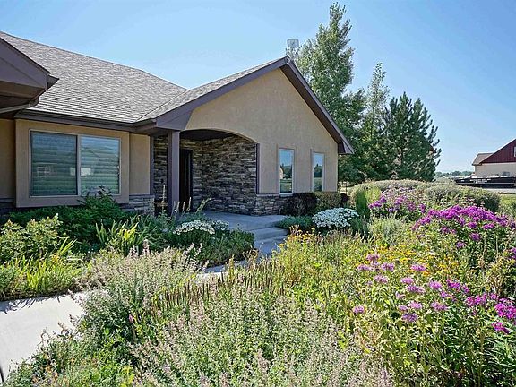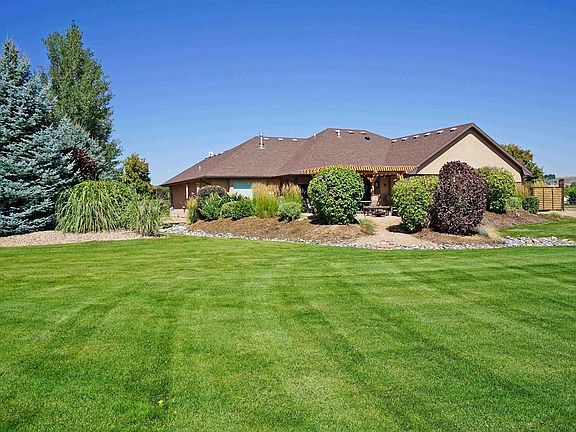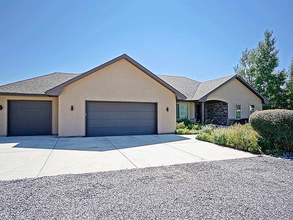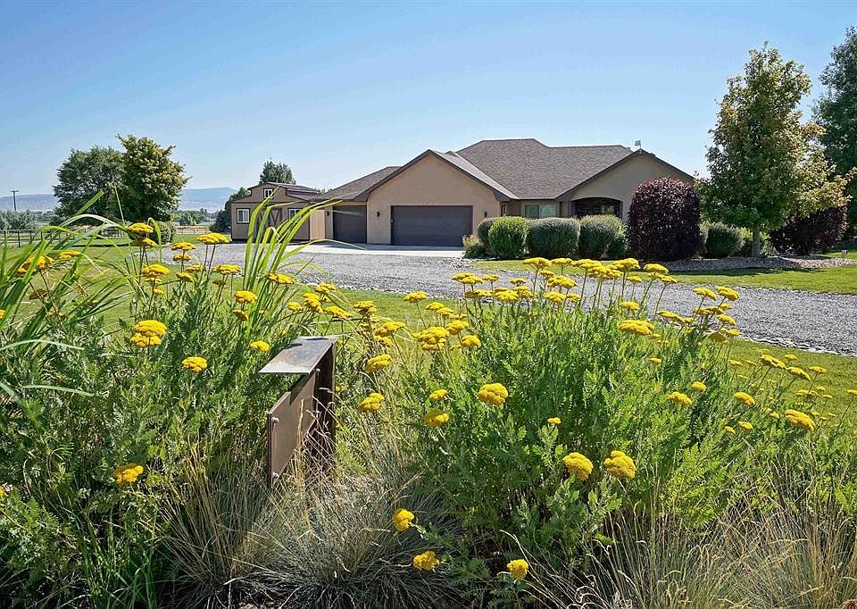 Occasionally, the ideal home becomes available, and this is one of those rare opportunities. This 2,250 square foot masterpiece, crafted by local artisans, harmonizes the art and skill of top-level builders with the innovative style of the owners. Situated on a two-acre property, approximately ten minutes northwest of Downtown Montrose, this custom single-level home boasts rich and thoughtful upgrades both inside and out. The property is a lush, beautiful oasis featuring xeriscaped areas, sweeping gardens, and a pristine lawn, all maintained by the HOA-provided irrigation water and an efficient sprinkler system. Located on the east side of a cul-de-sac, the home offers breathtaking views of the Cimarrons and Sneffels Ranges to the south, the Black Canyon to the east, the Uncompahgre Plateau to the west, and the Grand Mesa to the north. Designed to capture the glorious morning sun and provide shaded, covered spaces in the late afternoon, the back patio areas are perfect for entertaining and relaxing with family and guests. Inside, the home showcases the builder’s specialty in custom woodworking with unique trim work, cabinetry, completed closets, and expanded window ledges that frame elegant views. The grand and open main core features vaulted ceilings, solid hickory floors, a linear gas fireplace, and built-in shelving on either side of the mantle. The kitchen is a culinary delight with rich granite countertops, top-quality cabinetry, stainless appliances, and a thoughtfully sized center island with a separate wash sink and disposal. The oversized dining area, positioned to the east of the kitchen, brings in warm light and mountain views, seamlessly connecting to the patio areas beyond. A flexible office space along the west side can serve as a guest bedroom, workout room, or formal dining area, benefiting from rich light year-round that flows into the great room. The guest wing includes two well-sized bedrooms—one in the southeast and another in the southwest—along with an upgraded guest bath featuring a tiled shower and unique fixtures. The primary bedroom suite, located on the north side, impresses with mountain view windows overlooking the patios and views to the east and southeast. The luxurious bathroom includes a quality soaking tub and an oversized walk-in, fully tiled shower with no glass to clean. The cleverly positioned walk-in closet offers ample space, and the generous sizing, vaulted ceilings, and walkout to the patio and private hot tub make this a true retreat. Additional features include a half bath and an oversized laundry area with a large closet and a walk-in pantry leading to the oversized three-car garage, which opens to the west for bright and pleasant workspace and easy snow removal. A separate storage barn provides space for your recreational equipment for Western Colorado adventures. The back patio area is perhaps the greatest surprise, offering both covered and uncovered spaces with perfect light and stunning mountain views year-round. Established perennial gardens and rich trees enhance beauty and privacy, making this space an outdoor haven. This beautifully maintained Montrose home is ready for you, your family, and friends to enjoy.