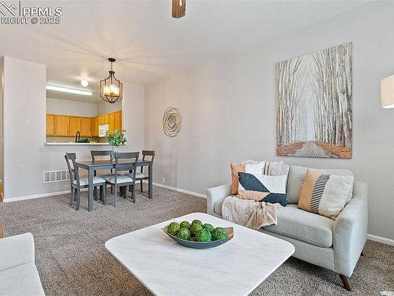 Spacious end unit with mature landscaping and low-maintenance living! The charming 7x12 covered front porch welcomes you into a bright entryway with warm wood floors, opening to a cozy great room with soft carpet and windows overlooking the peaceful common walkway. The adjoining 10x7 dining area features a stylish new chandelier and breakfast bar pass-through to the kitchen, perfect for casual meals or entertaining. The kitchen offers plenty of storage with upper/lower cabinets, durable Formica counters, wood floors, and appliances including an electric range, refrigerator, and built-in microwave. Conveniently located off the kitchen, the 21x22 finished garage makes unloading groceries a breeze and includes niches for extra storage plus a water spigot for easy clean-up after snowy days. Also on the main level: a 3x5 laundry closet with electric hookup, access to the crawl space, and a half bath with natural light. Up the switchback staircase, you’ll find a spacious 12x14 bedroom with stunning Pikes Peak views and ceiling fan pre-wiring. A second bedroom down the hall features new carpet, a closet, and fan wiring as well. The full hall bath offers double sinks, wood laminate floors, a linen closet, and a tub/shower combo. At the end of the hall, the primary suite boasts fresh carpet, a 6x8 walk-in closet, and an attached bath with double sinks, a linen closet, medicine cabinet, and private commode/tub area with a window for light. Close to shopping, dining, and entertainment, this home is perfect for anyone seeking a carefree lifestyle with weekends free of yard work or heavy maintenance. PRIME LOCATION! Walk to the grocery store, dining, amenities, and the neighborhood park is right across the street (wow!). On the Powers corridor near Dublin, this superb location offers quick and easy access to Woodmen (East/West) and Powers (N/S). Great schools, great neighbors, great low-key vibe perfect for your family or as a rocking investment property!