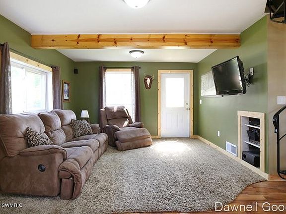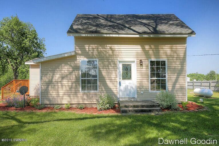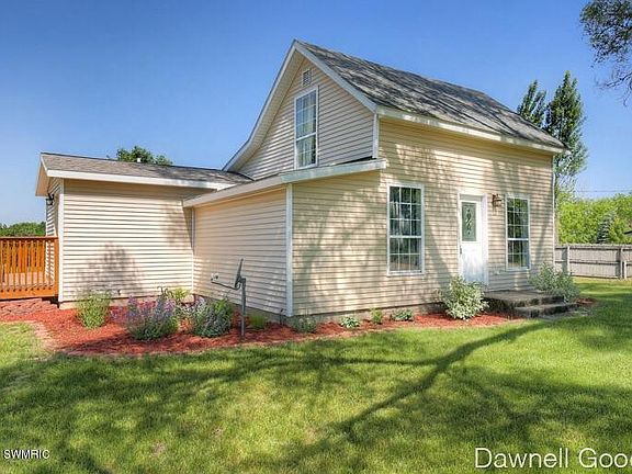 Very charming modern style interior home. Centrally located to schools and highway 131. Just 30 minutes north of Grand Rapids. Furniture in living room stays, including the mounted flat screen TV, dining table, and all furniture upstairs. Spiral staircase to upper bedroom. Mud room with washer and dryer. Outbuilding, 2 story dog house, and beautiful deck for entertaining. All this situated on 8.3 acres, partially wooded with Rice Creek running south on the property.