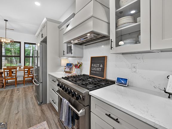 Welcome to this stunning, like NEW four-sided brick ranch in the desirable Stratford on Lanier community. Thoughtfully designed with an open floor plan and split bedrooms this Urban Farmhouse home offers both comfort and privacy. Soaring 10'-14' and cathedral ceilings throughout, can only be appreciated in person, along with custom stained wood plantation shutters add elegance and light throughout, while the gourmet kitchen features waterfall quartz and cabinets painted in the timeless Benjamin Moore Revere Pewter-serves as the heart of the home. The inviting living area features a shiplap fireplace painted in rich Iron Ore, creating the perfect focal point. Step outside to enjoy a partially covered, coordinating paver patio overlooking a spacious, wooded lot of more than half an acre. Additional features include double front doors, a 2-car garage, attic decking, custom closet systems for optimal storage, crown molding, and high end plumbing fixtures. With its blend of modern style and traditional design, this custom built home in 2023 offers a rare opportunity in one of Gainesville's most sought-after neighborhoods.
