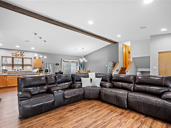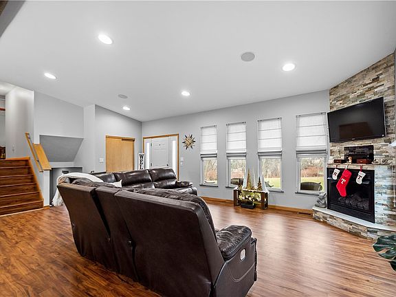 Discover a serene retreat on nearly 5 acres, featuring an updated multilevel home with 3 beds,2 full baths! Open floorplan with vaulted ceiling & recessed dimmable lighting and updates throughout. Enjoy stunning views through panoramic windows that frame a beautiful fireplace, stainless Steel appliances, LVP flooring, and more! Built-in stereo system & surround sound.  Flat, tree-lined yard that is unmatched. Spacious primary bedroom featuring a lg bathroom with garden tub & a new deck just steps from your bed; your own retreat. A generous family room offers additional living space. Back concrete patio offers a great space for relaxation or gatherings, while a covered front porch invites you to enjoy scenic views.  Additional room off the family room w space plumbed for a full bath, which can serve as a fourth bedroom, guest suite, or office. The basement level provides more versatile space to meet your needs. Don't miss this INCREDIBLE property & home!