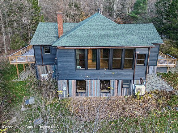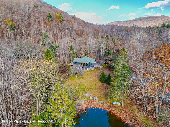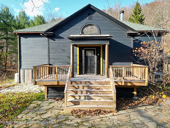 Welcome to a piece of history seamlessly blended with modern comfort and period-accurate restoration. This unique property, originally built in 1909 as a schoolhouse and was expanded in 1919 by the Chichester furniture factory for the children of its employees. Steeped in history, the home is situated on 2.5 acres of picturesque land with stunning mountain and creek views and a serene pond. The property underwent a meticulous two-year restoration project aimed to preserve original elements while incorporating repurposed period details. Step onto exquisite old-growth heart pine floors reclaimed from the joists of a demolished 19th-century Hudson River factory, offering both durability and a story with every step. The oak doors throughout the house, salvaged from a 1910 brownstone, add character and authenticity. Many of the schoolhouse lamps are original milk glass and hardware that have been carefully restored. The entrance chandelier, a stunning focal point, was salvaged from a Brooklyn church. The centerpiece of the great room is a Frank Lloyd Wright-inspired fireplace, acquired at auction six years ago, providing both warmth and a statement piece. The main bathrooms feature full-wall Calacatta marble subway tiles, echoed in the kitchen counters and backsplash. Enjoy a soak in one of the two custom copper-clad clawfoot tubs, designed for both comfort and aesthetic appeal. Unique Art Deco cement encaustic tiles serve as stunning accent pieces in the lower level entrance and kitchen window trim. Stay comfortable year-round with an efficient ductless mini-split system and custom-made Anderson windows that ensure both energy efficiency and historical accuracy. The entrance columns, recreated using traditional barrel-making techniques, add to the home's authentic charm.