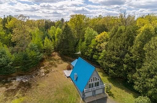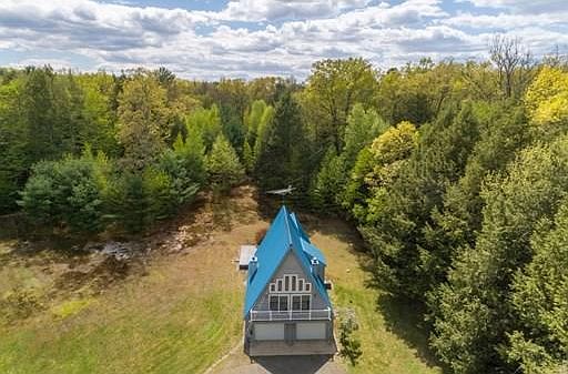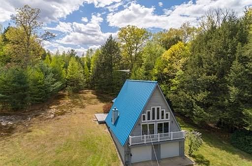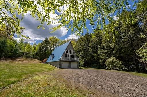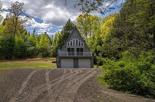 If you are looking for total privacy this well maintained Vinyl sided Contemporary A-Frame is nicely situated off the road on 10.5 acres of land. The Metal roof is an upgrade that you will get to enjoy for a long time. The first floor offers an open floor plan that is great for entertaining. The living room has a knotty pine tongue and groove wood, wood stove, a cathedral ceiling, lots of natural sunlight comes in through the large windows and sliding doors that access the front exterior balcony. There is a spiral staircase to the bedroom on the 2nd floor. The kitchen is open to the large dining area that also has a custom wood ceiling. The master bedroom suite offers a 2nd full bathroom and ample closet space. The lower level offers plenty of storage space, laundry room, a nice sized workshop and access to the 2 car drive under garage. Enjoy nature at it's best while sitting on the large low maintenance deck.