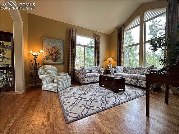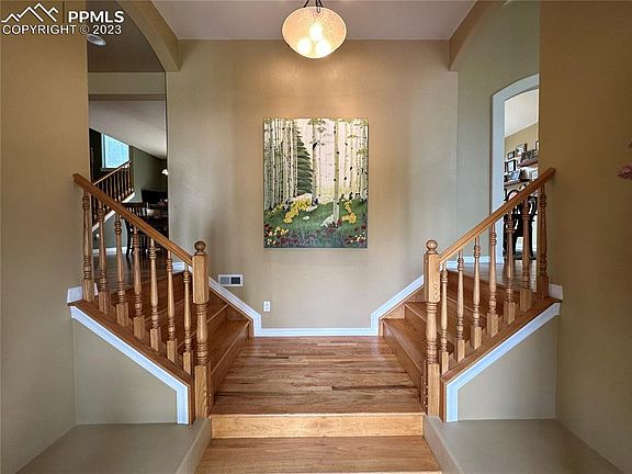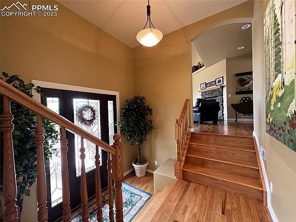 Welcome to your woodland oasis in the foothills of Cheyenne Mountain, in the highly-sought after Broadmoor Spires neighborhood and award wining District 12 schools. The spectacular 1/2 acre wooded lot offers ample privacy within a nature preserve with daytime mountain views and nighttime city lights. Shopping, groceries, services and other conveniences are as little as 5 minutes away. The grand entries split staircases are flanked by a formal living room with vaulted ceilings and oversized windows and a cozy family room with a gas log fireplace and two story ceilings. The formal dining room is located between the formal living and kitchen, and it also has vaulted ceilings and tons of natural light. The kitchen features unique marble countertops, all stainless steel appliances (less than 5 yrs old) and two-toned cherry wood cabinets. The primary bedroom and en-suite is located on the main floor which is nicely appointed with a gas log fireplace, walk-out balcony, 5 piece bath (separate shower and jetted tub) and walk-in closet. A 1/2 bath and laundry round out the main level living space. Upstairs you will find a loft space, 4 more bedrooms and 2 Jack-n-Jill baths (one full & one 3/4). 3 of the 5 bedrooms are large and the 4th is more than adequate sized. The basement has a studio apartment with a gas log fireplace and a kitchen with stone countertops and solid wood cabinets. There is also a large storage room that the current owner also uses as a workshop and a 3-car garage attached at the basement level. One of the highlights of the property is definitely the backyard oasis. Comprised of an expansive concrete paver patio with a built-in gas fueled BBQ and fire pit, cascading water feature (programmable) and fenced in garden area. The high-efficiency washer and dryer are like new and the 3-car garage has workbench, built-in cabinets and shelves. The home security system includes 3 cameras.