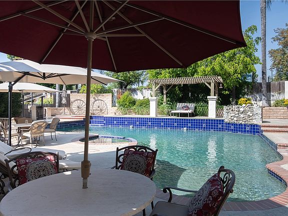 Situated on a quiet cul-de-sac in the heart of Riverside, this 2-story executive home has been recently renovated to perfection: You will feel like you are on vacation every day! 4 bedrooms and 2.5 baths in the main house plus a detached guest/pool house with large entertaining area, fireplace with gas log, kitchenette (no stove), breakfast nook separate bedroom and an additional 3/4 bath and below on the ground floor is an updated gym room. Dive into the Pebble Tech pool and spa with customizable ambient color lighting and a waterfall or enjoy the cool evening by the fire pit. Take in the views from the wrap-around balcony, several patios and a pergola. New exterior lighting. Cross fenced pet or garden areas and 15 bearing fruit trees. The grounds are an ideal setting for pool parties and entertaining with family & friends or take advantage of the seclusion as your own private retreat. 3 car attached garage with 50 AMP plug for charging electric vehicles and a gated breezeway for additional storage. Extra-large concrete driveway provides loads of off-street parking. As you enter the home you will pass through a tiled courtyard patio. The double entry doors have leaded glass and open to the step-down formal living room with soaring open-beam ceiling, neutral tiled floors, built-in bookcases and uniquely designed curved, corner fireplace. Two steps up and you will find the formal dining room and sliding glass doors that lead to a patio in the rear yard. An arched doorway leads you to the updated kitchen with loads of granite counters and cabinet space, built-in dining space and newer appliances, including a Samsung induction, convection oven/stove w/air-fry. The kitchen is open to the family room with a cozy re-faced fireplace and lighted built-in bookcase. Note the inset overhead lighting in the kitchen and family room. Laundry chute to the downstairs laundry room has also been updated and includes lots of cabinet storage space, folding station and large stainless sink plus adjacent, remodeled downstairs guest bath. Upstairs you will find 4 bedrooms with new carpeting. The primary bedroom features remodeled bath with free-standing soaking tub and separate walk-in shower. The secondary bedrooms share a fully remodeled hall bath with double basins. There are lots of windows throughout this home and ceiling fans in almost every room for amazing cross ventilation and energy efficiency. Central vac system, Security cameras and Ring Doorbell and so much more!