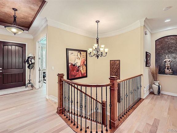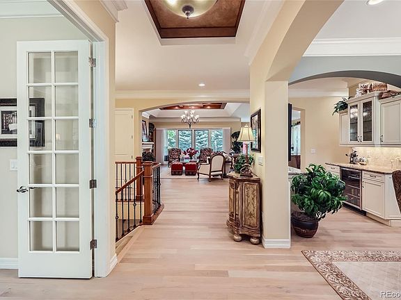 This Race Court home is part of the exclusive gated community of Orchard Park. Upon entering the charming lamppost lined street, you will see this lovely custom home looks out on a private pond with water feature. An open concept home, it offers 4 bedrooms, 4 baths and loads of charm with vaulted ceilings, white oak floors, and thick crown molding. The oversize kitchen has 28 feet of cabinetry, granite countertops, large center island, and quaint breakfast nook. Between the large kitchen is a bar area complete with beverage center which serves the classic and inviting dining room. The spacious master suite with elegant plantation shutters is adjoined by a large ensuite bath and custom closet. The main floor also features two offices, mudroom, and guest room with ensuite bath. The expansive lower level features a large bar area, card room, exercise room (presently used a children’s play room), movie/sports watching area with fireplace, pool room, and wine cellar. Guests will enjoy two more bedrooms with bathroom. The large covered patio is accessed by the 12 foot Pella sliding doors which bring the outside in. The patio with built-in grill leads to a serene tree covered back yard with charming water feature. The home is minutes from the Highline Canal and DeKoevend Park. Easy access to Cherry Hills Marketplace, Southglenn, and DTC.