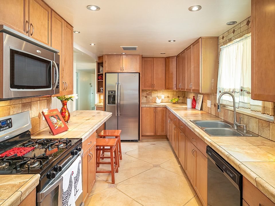 Beautifully updated Kitchen w/ SS appliances including NEW GE Refrigerator, easy glide pull out shelves, concrete floors & neutral colored walls in living, dining and Kitchen while bedrooms and baths have tile flooring. Gorgeous wooden French patio doors off of living/dining areas invite you to the pebble-tec pool & backyard. Great for entertaining your family and guests. Check out the spacious hall bathroom & the built-in shelves & desk in the spare bedroom. Enough room in Master for your king size bed with access to pool from Master Bath... Enclosed Laundry room off of covered porch. A short walk to Park Place Mall & movie theater is an added bonus to this home's location. Neighborhood park walking distance west on 18th st. Owner Lic. AZ RE Agent DON'T WAIT SCHEDULE A SHOWING TODAY!