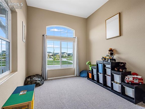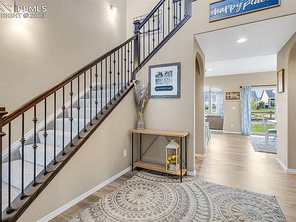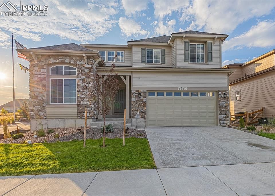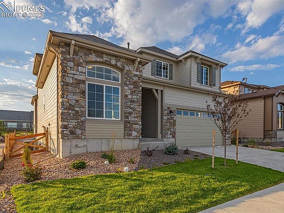 This stunning home located across from Ashford park located within the sought-after Banning Lewis Ranch community boasts a remarkable Northern European exterior and presents the renowned Covington Homes - Marseille floor plan, spanning 3,110 square feet. From its inviting interior to its thoughtfully curated features, each detail has been meticulously designed with your lifestyle in mind. Step into a world of elegance as you explore the gourmet kitchen, complete with stainless steel appliances, a gas cook-top, and designer staggered cabinets with soft-close doors and drawers. The stack stone fireplace in the living area adds a touch of sophistication, creating a cozy space to unwind and relax. Upstairs, discover four spacious bedrooms, embodying comfort and luxury. Noteworthy features include elongated toilets, wrought iron stair handrail spindles, and meticulous attention to detail throughout. Extend your living space outdoors with the optional extended covered patio, where you can relish the awe-inspiring Pikes Peak views while hosting gatherings. Beyond the boundaries of this exquisite home lies the thriving Banning Lewis Ranch community, offering parks, pickleball courts, pools, a water park, a gym, and scenic trails—a lifestyle that's second to none. Embark on a journey to explore the perfect blend of luxury and practicality. Schedule a private tour today and experience the home you've been longing for. Welcome to the ultimate Colorado living experience.