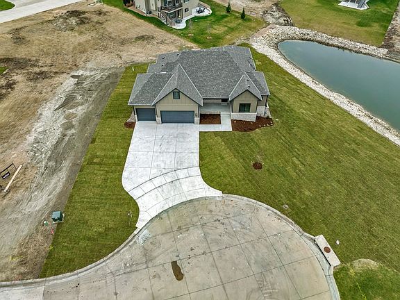 Luxury waterfront living with a small town feel! Nestled in a quite neighborhood in Bel Aire sits this modern masterpiece built by H&H Homebuilders. Upon entering this home you will be immediately captivated by the -truly- grand foyer with 11" box ceilings! Immediately to the right of this split floorplan you will find two bedrooms with generously sized closets and the guest bathroom. When entering into the living room you will be blown away by the modern tile feature wall with built in windows which highlight the view of one of the communities stocked ponds! The living room is not only spacious, but it is also cozy with a modern electric fireplace and custom mantel! This home is an entertainers dream starting in your chef's kitchen with an oversized island, gas range, custom exterior vented rangehood, and walk in panty. Off the dining room you will find direct access to your screened in and covered concrete deck which allows for the perfect flow for indoor and outdoor entertaining! Enter into your owner's suite, where the modern design continues, with a decorative feature wall. The owner's suite is as beautiful as it is functional with the luxury of a double vanity, large linen cabinet, and a zero-entry custom tile shower with a built-in niche and bench! You will also fall in love with the spacious master closet with a built-in dresser and custom shelving including off season & long hanging space. Did we mention how well thought out and convenient this floor plan truly is? The laundry room located directly off the master bath and directly across from the drop zone making this plan exceptional for both form and function. The unfinished walk-out basement allows for you to grow at your own pace and customized the space to your liking and it is already plumed for a wet bar! The basement also includes a safe room! Added perks: A whole home humidifier! (sprinkler, sod, and landscaping coming soon!)