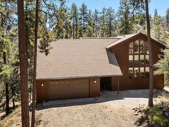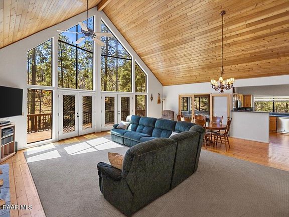 Situated among the towering pines, on over 2 acres and backing to the Prescott National Forest, this beautiful home offers an immaculate setting. The property boasts an owned solar system, ensuring sustainable living with peace of mind. As you approach, a flagstone patio walkway leads to the front door, setting the tone for the welcoming ambiance. Expansive decks offer captivating vistas of the forest, some featuring retractable SunSetter awnings for added shade. Upon entry to the home, Exuding warmth and character, a wall of windows in the great room frame the picturesque forest views, high volume vaulted ceilings with tongue and groove Knotty pine and a beautiful stacked-stone high-efficiency wood-burning fireplace. The kitchen impresses with a suite of stainless steel appliances,