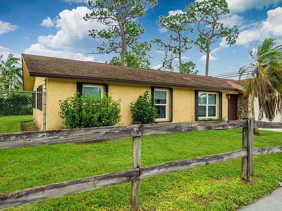 4 bedroom 2 bath with NO HOA on a corner lot in Lake Worth. This home has a huge yard and room for a pool! As you enter the home, it opens up to the living room with a built in shelving unit. The kitchen and dining room area are spacious with sliding glass doors that lead out to the patio. The kitchen has been remodeled with beautiful white cabinetry with plenty of storage space, granite countertops and backsplash, brand new refrigerator, new wood laminate flooring, a water treatment system under sink with a spigot for filtered water and a great view of the backyard. The master bedroom has plenty of natural lighting and the master bath has been updated with a tile bath that reaches the ceiling and lovely cabinetry.