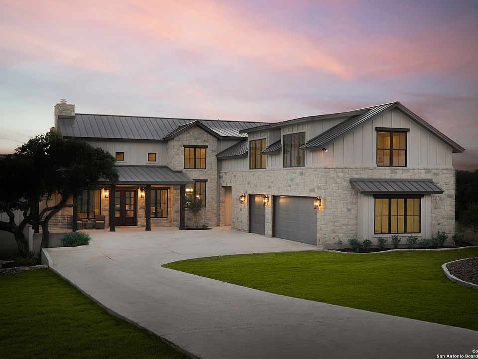 Step into an unparalleled showcase of Hill Country Modern design at 5978 Colin Ridge, a spacious 4,357 sqft residence masterfully built by the Southern Land Company. Situated on a generous 1.4-acre lot in Copper Ridge-a gated sanctuary in the highly acclaimed New Braunfels Independent School District-your exclusive retreat awaits. The home greets you with soaring ceilings, luminous white oak floors, and striking contrasts of dark wood beams against stone accents. This efficiently designed estate offers 5 bedrooms, 5.5 bathrooms, a 3-car garage, ample storage, and multiple living spaces. The main level hosts the primary suite and a guest room, each complete with en-suite bathrooms. Ascend to the upper level to discover three additional bedrooms, bathrooms, and a versatile game room. Elegance and ease define the designer kitchen, adorned with quartz countertops, a generously sized island, custom cabinetry, and top-of-the-line stainless appliances. A windowed backdrop above the farmhouse sink infuses nature into your daily rituals. Indulge in the spa-like serenity of the primary suite, boasting a lavish soaking tub and frameless glass shower. Sliding doors seamlessly extend the living space to a generous back patio. Here, you are enveloped by mature oak trees and treated to far-reaching views that stretch for miles. The patio is outfitted with a fireplace, outdoor kitchen, and myriad seating options. Copper Ridge offers resort-style amenities: lap and play pools, a pavilion with a fireplace, picnic areas, tennis, and basketball courts. For those seeking adventure, New Braunfels and the charming town of Gruene provide an array of dining and shopping venues. Outdoor enthusiasts will appreciate proximity to Canyon Lake, The Guadalupe River, Natural Bridge Caverns, and the renowned Schlitterbahn Waterpark. Strategically situated between San Antonio and Austin along the I-35 corridor, New Braunfels stands as an ideal location to call home.