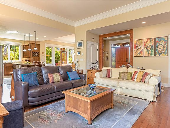 CRAFTSMAN CHARM in Central Qualicum Beach. Built by Klobchar, this timeless Craftsman rancher sits on a corner lot surrounded by English cottage-style gardens with fruit trees, berries, figs & kiwi. Timber frame accents, shake siding & lush landscaping create an inviting first impression. Patios extend from the living, dining & primary suite for seamless indoor-outdoor living. The 1,968 sq ft open-concept plan showcases high ceilings, crown moulding,maple floors, fir doors, slate accents & a gas fireplace w/custom built-ins. The gourmet kitchen offers maple cabinetry, granite counters, s/s appliances, central island & wine fridge. The Great Room’s oversized windows & garden doors flood the space with light. A spa-like ensuite complements the serene primary suite, & 2 additional bedrooms complete the spacious layout. Outdoors, enjoy timber framed patios, pergolas, covered seating, a central courtyard & fenced yard. Walk to the beach & a few minutes stroll to Qualicum’s Village Center.