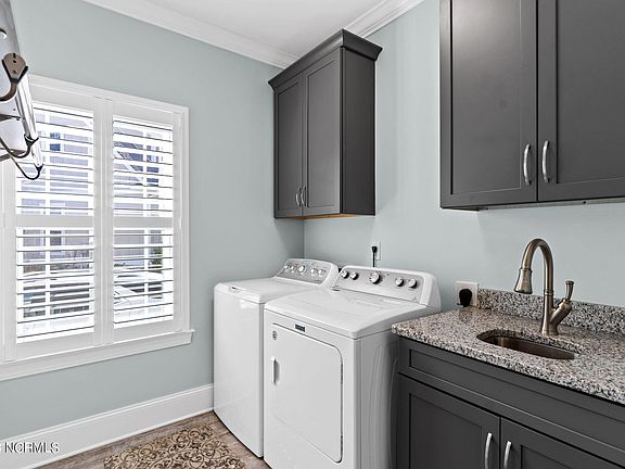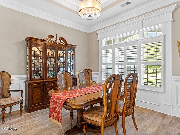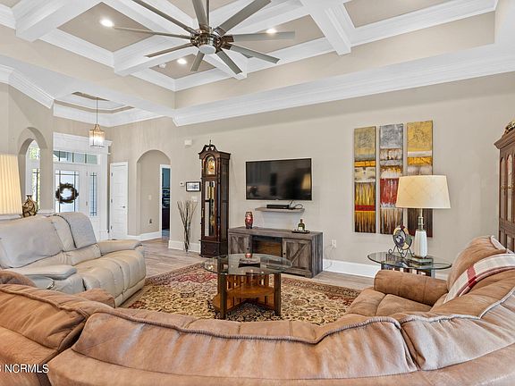 5BR/4BA Craftsman Estate home located in the pristine Calabash, NC gated community of Crow Creek. This beautiful home boasts arched cased openings with deluxe 5 1/4 crown molding, chair rail, 7 1/4 baseboard, custom wainscoting, and window trim, 12' ceilings in the great room, dining room, kitchen, and breakfast area with customized coffered ceilings in the great room and master.
