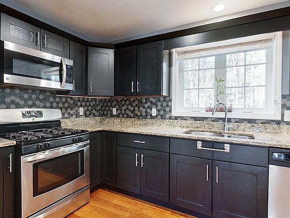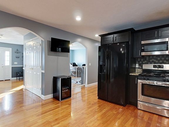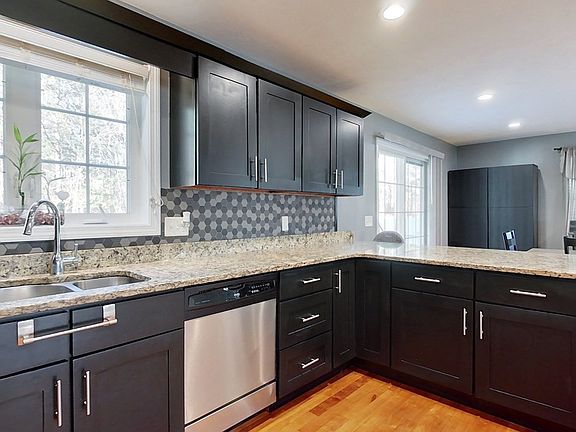Beautiful center door Colonial w/ a seamless flexible floor plan offering 3 levels of finished living space. Gleaming wood floors welcome you in & flow throughout the main level. To the right find the Living Room w/ recessed lighting that continues into the eat-in Kitchen boasting counter seating & a plenty of sleek black cabinetry complimenting the honeycomb backsplash. A Family Room (or office) & hallway to a guest ½ BA w/ laundry & 2 car garage finish the main floor. The 2nd floor offers primary quarters occupying one side w/ 2 closets & a private ensuite along w/ 2 Bedrooms & an addt’l Full BA on the other side. A 4th BDRM + 2 bonus rooms can be found in the finished walk up 3rd level. More space can be found in the basement w/ a finished bonus room & over 600 sq ft of space perfect for storage, workshop, etc. Enjoy a private wooded back lot to view from the 20x20 deck & easy access to everything - Walmart, restaurants, Fitchburg State & more! Assumable leased Solar available.