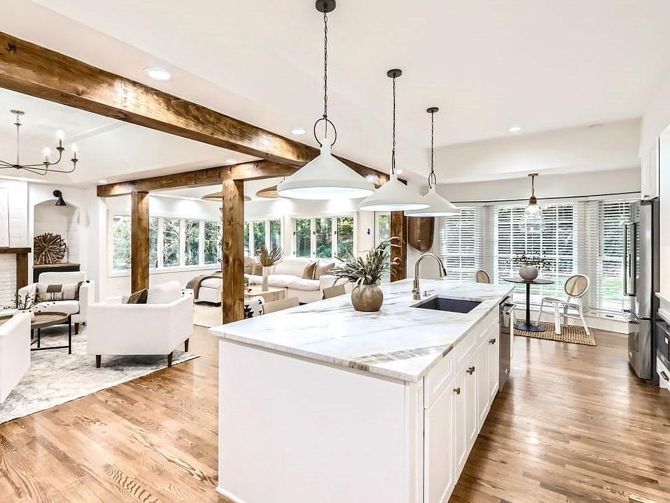 Incredible sprawling, light filled home meticulously renovated with modern amenities and classic style. Situated on over 2/3 acres, this re-designed home offers a stunning new floor plan w/welcoming foyer w/inlaid wood and tile and steel and glass front door. White oak flooring spans entire main level, leading to the gorgeous kitchen with leathered quartzite counters, huge island, 8 foot stove alcove with built in spice shelving, professional range, new stainless appliances, and built-in wine refrigerator. Separate pantry/mudroom is strategically placed off garage for ease of convenience. Designer lighting throughout home. Living room is light and bright and adjacent to fireside familiy room. Sunroom has wall of windows overlooking extremely private backyard. Main suite has large walk in closet, with additional closet in main bath. Main bath is spa like and huge with extra large shower, double vanities with waterfall quartzite counters, built in cubby for linen storage and separate soaking tub. All bedrooms in home have private baths. Huge daylight terrace level has second family room, media room, extra rooms for exercise or home office use, and even a cute built in niche under the stairs. Tons of storage as well. New HVAC, electrical and plumbing. There is a voluntary HOA with socials, holiday events, and book club to name a few. This is a WOW house!!