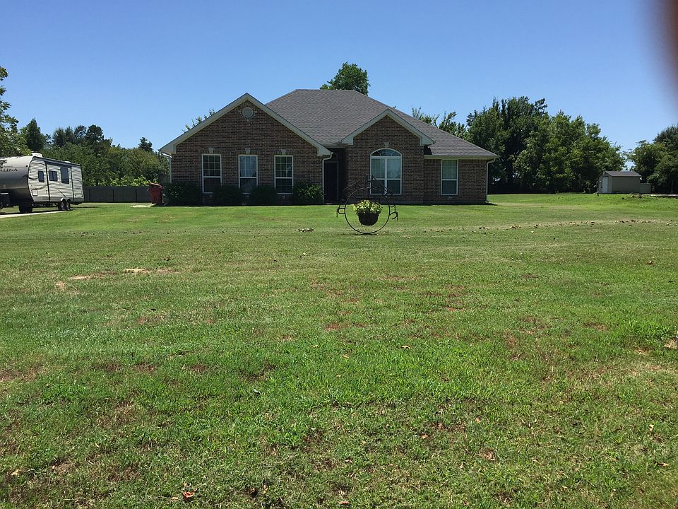 This house is located on nearly and acre of land. lots of yard space, above ground pool 16 by 56 in a chain linked fence in he back yard. the yard is so much bigger than we have fenced off. Green apple tree. and a huge front Yard.