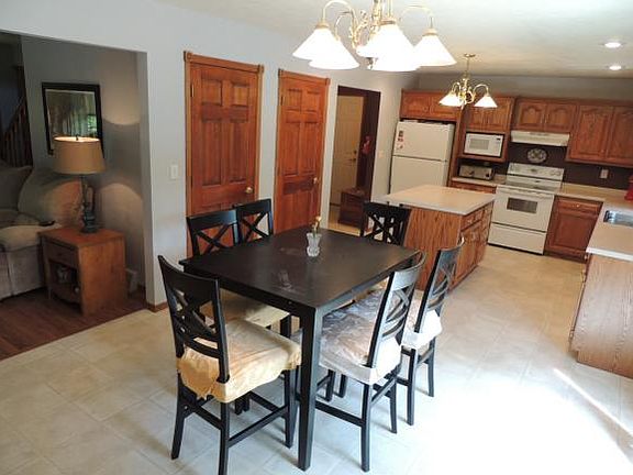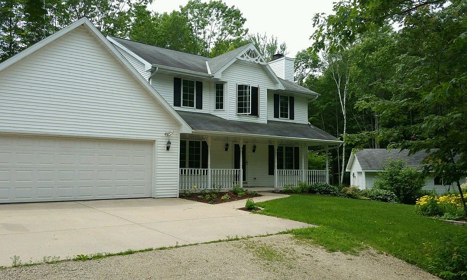 5.76 acres backing up to the Machickanee Forest! Fish in your own pond or hunt in your backyard! Welcoming front porch,great rm w wood burning fireplace & fully applianced kit w center island! Din rm leads to expansive deck w pond view & your own beach & dock! Over 2000 sq ft, 2 car att. gar & 22x24 insul det gar. 1st flr lndry, fin. lower level & a lg mstr suite w sitting area & walk in closet!!