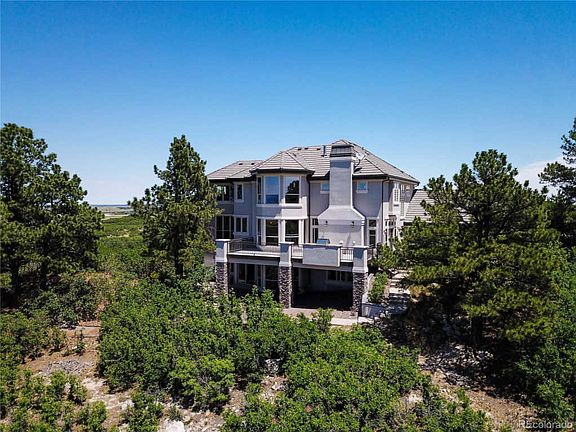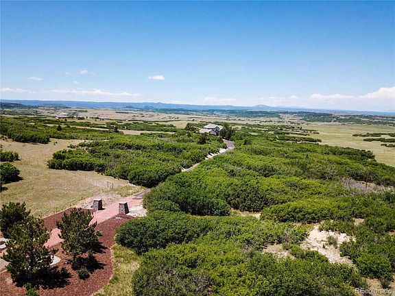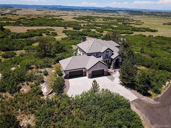 One of a kind home....architecturally drawn to highlight the features of the terrain and awe-inspiring views of the Front Range. The picturesque 35 acre site is richly covered with rolling hills of scrub oak, exquisite rock outcroppings and an abundant amount of pasture or horse land. A scrub oak-lined driveway leads to a majestic 3,875 square foot home nestled among carefully-placed pine trees with an abundance of custom details. A grand wrought-iron curved staircase at the Foyer and oversized windows throughout the home spotlight the all encompassing views. The Living Room is graced with a vaulted two story ceiling and a full-height gas fireplace that flows into a formal Dining Room. The welcoming Kitchen epitomizes a gathering space with rich cabinetry, multi-level island, and adjoining Nook that opens to the full-length deck. The inviting Family Room lends itself to an entertaining outdoor fire pit patio. The spectacular Master Suite showcases a gas fireplace, relaxing sitting area, dry coffee bar adjoined by a luxurious bath that features double sinks; a soaking tub; a walk-in stone shower with dual heads and a relaxing rain overhead shower; and, a walk-in closet. Two generously-sized upper level bedrooms each feature their own private baths with walk-in closets. A secondary back staircase allows easy access to the upper level Laundry Room. The full unfinished walkout basement could be used as additional bedrooms, activity space or office space with its private access to the garage and walkout and two bath rough-ins. A 3,200+ square foot heated workshop is tucked below the home offering power including 220 volt, water, heat, and two extended height overhead doors. Water rights in the amount of 10 acre feet per year of the Upper Dawson Aquifer are an added feature of this home. This unique home offers the sense of seclusion yet only minutes to the nearest grocery store, and easy access to Castle Rock, the DTC, and Colorado Springs.