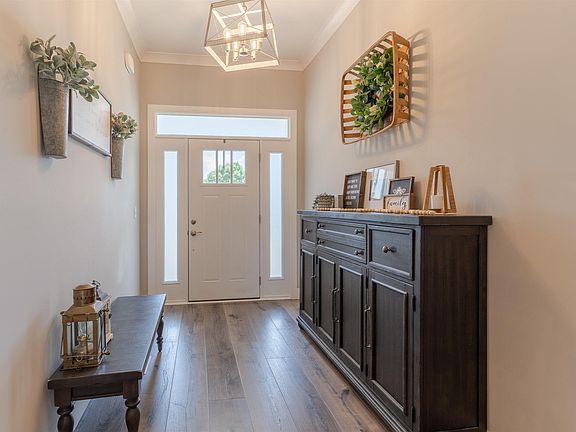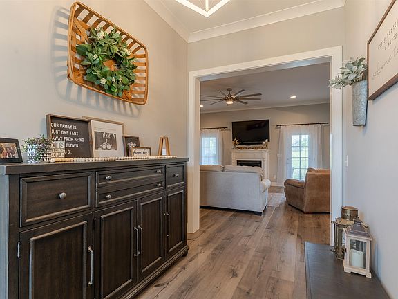 Nestled on a beautifully landscaped lot just over an acre, this stunning 1.5-story Craftsman-style home offers approximately 2,900 sq. ft. of thoughtfully designed living space. Boasting 4 bedrooms, a bonus room and 2.5 baths, this home seamlessly blends style, comfort, and functionality. Step into the large open-concept great room, kitchen, and dining area. The gourmet kitchen features custom white Amish-made cabinetry, striking castle-style uppers, granite countertops, stainless steel appliances including a gas range, and a large breakfast bar with a stainless steel farmhouse sink. The white subway tile backsplash is laid in an elegant herringbone pattern for a touch of charm. The great room showcases warm hand-scraped laminate wood flooring, a cozy gas log fireplace, and 10-foot ceilings. Enjoy easy access to the inviting outdoor living area, where you'll find a covered back patio complete with string lighting, a mounted TV, and an extended open patio—perfect for relaxing or entertaining guests. A portion of the backyard is enclosed with aluminum fencing The spacious primary suite is a true retreat, featuring a tray ceiling and an oversized ensuite bathroom complete with double rectangular sinks, a soaking tub, a walk-in ceramic tile shower with a glass pivot door, a private water closet, and a massive walk-in closet. All bedrooms offer plush carpeting, while the baths and laundry room feature porcelain tile. Solid wood shelving is found in all closets and pantries. An oversized 3-car sideload garage provides plenty of storage and functionality.