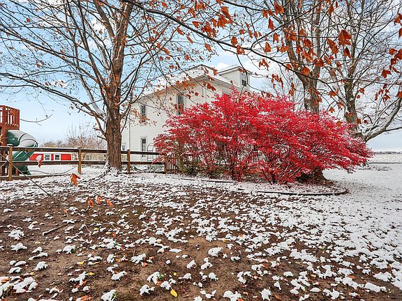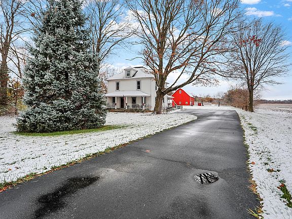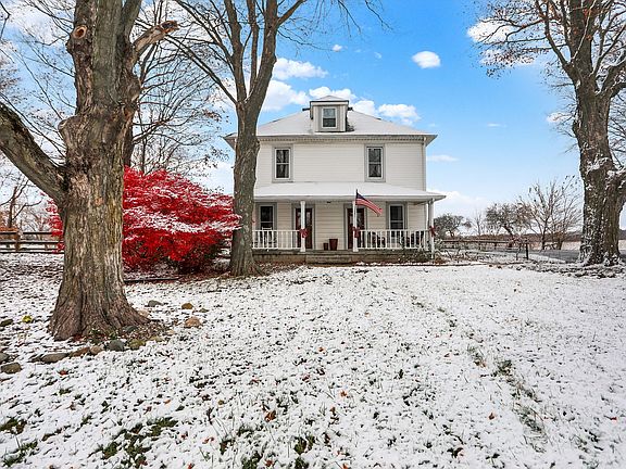 Charming hobby farm close to everything while having that small-town feel! This beautifully restored 1800s farmhouse rests on over 5+ acres in the desirable Pendleton School District. This 3-story, 5 bedroom, 4 bath home has many updates; including brand-new flooring throughout the entire house. This rare find offers endless potential. The property includes 3 vintage barns, chicken coop, and fire pit with shed at the back of the property. The home maintains its historical charm with original woodwork throughout, including a stunning staircase and French doors dividing the expansive living and family rooms. The farmhouse kitchen has a large island and butcher block countertops. Dining area just off kitchen opens onto a spacious deck; perfect for entertaining. The upper level features four generous sized bedrooms and two full bathrooms. The Third floor has the fifth bedroom and additional full bath; ideal for use as a bedroom or flex space. The primary suite offers fresh paint and a spacious ensuite with clawfoot tub, shower stall, and dual sinks. Enjoy the timeless beauty of the property's iconic vintage barn, which showcases rustic wooden beams and traditional wood peg construction. The oversized 30x60 garage accommodates farm equipment, boats, or larger vehicles, while the workshop provides ample space for tools, woodworking, or storage. This property is a unique opportunity to enjoy open space and tranquility just minutes from all the conveniences of Hamilton Town Center, Noblesville, Fishers, Muncie, and Anderson.
