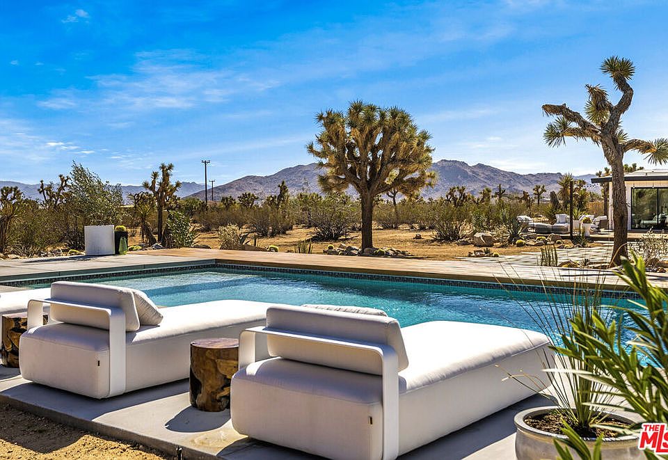 Outstanding, beautifully reimagined, Mid Century Modern Joshua Tree compound with casita, a 40' heated swimming pool, spa & mountain views on nearly 6 private acres by design collective KALM. Modern interior spaces w/charcoal colored concrete floors, whitewashed walls & expansive picture windows. Custom walnut kitchen w/island & abundance of white quartz counter space, newer appliances &14' Panoramic folding doors opening onto deck. Great room with original working fireplace w/vintage tiled hearth & stone surround. New systems throughout including Nest, ducted HVAC, plumbing, electrical & custom lighting. Each of the two main house bedrooms have distinctive Cle tiled baths with modern barn doors & access to decking, patios & pool beyond. A third bath in the main house has a large copper soaking tub and window wall. Great room opens to an expansive 60' deck looking toward the swimming pool & desert landscape beyond. Newer swimming pool w/custom automated pool cover, Baja shelf & a 60' concrete and Brazilian Garapa wood surround and a seven seat, freestanding Hot Tub/Spa. Luxurious, permitted detached Casita w/full ensuite bath & direct access to a beautifully tiled outdoor shower. The landscape is a forest of Joshua Trees, 400 year old Yucca trees, a hammock chill zone & space for a vintage trailer. A chic & hip hideaway for creatives & privacy seekers surrounded by acres of BLM land. A truly magical property for a vacation rental, desert escape or full-time residence. Property currently has a short term rental license (main house and casita my be rented separately or together). Leased solar transfers to the new owner. Only 10 minutes to Joshua Tree's lively downtown area and the park, 55 minutes to Palm Springs & two hours to DTLA. The coveted design team at KALM meticulously designs & curates only one property annually. This is a rare opportunity to purchase a unique, top-notch compound. Property is located in Joshua Tree with a Joshua Tree address and zip code. The house is currently the owner's 2nd home and is rented as a premium short term rental with significant income for 2023 & 2024 with a solid cap rate of 12%. Furnishings available outside of escrow.