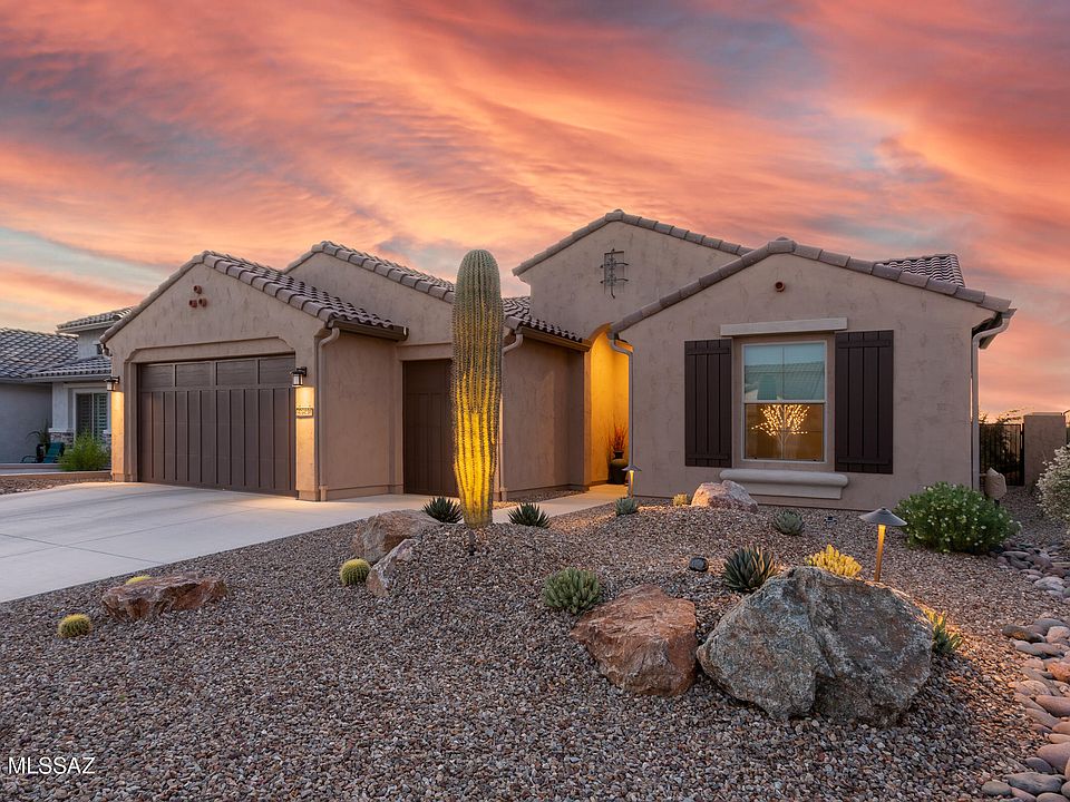 A very well-kept and nicely appointed expanded 1568 sq. ft. Hermosa Model home with the Optional Golf Cart Garage, and Optional Expanded Laundry Room was completed in March of 2021 when the current owners moved in. This home is the perfect size for a couple to live here in SaddleBrooke Ranch + have quests stay with them as this home encompasses the following: 2-Bedrooms, 2-Bathrooms; Great Room; Dining Area; Large Kitchen Island; Generous Walk-In Closet & 42 X 60 Shower w/ Built-In Seat in Master En-Suite; Owners Entry Valet w/Storage Cabinets; Separate Expanded Laundry Room w/plenty of storage cabinets; 140 Sq Ft. Covered Outdoor Living Space; Deep 2-Car Garage w/Optional Golf Cart Garage; 9 & 10 Ceiling throughout the Home. This home has incredible landscaping in both front and back yards and backs up to the desert with unimpeded views towards the North-West for some incredible sunsets. Extras include Snake Fencing on back and side walls, 5-Tucson Rolling Shades on back covered patio, and state-of-the-art GE Soft Water System.