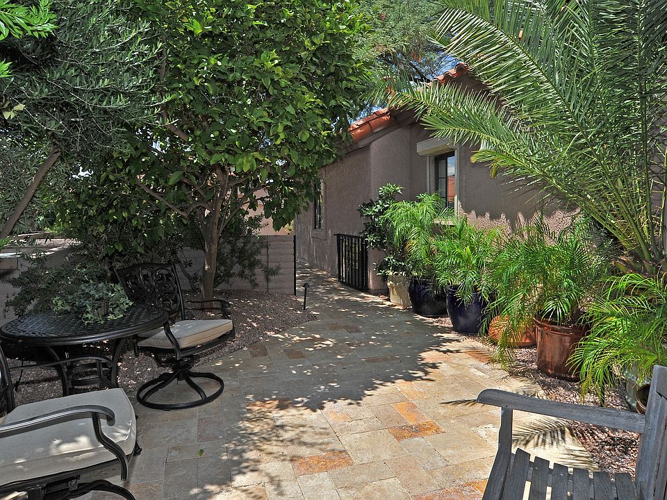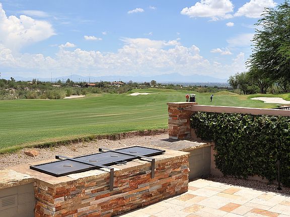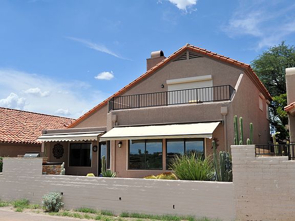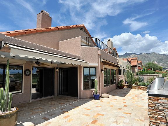 Golf resort living at its finest. Surrounded by 180 breathtaking mountain views, enjoy picturesque lush green views only steps away from the course. Updated in fantastic move in ready condition three bedroom plus den, three bathroom 2,489 Sq Ft masterpiece. Sellers made many designer upgrades: travertine pavers walkways & covered patios, complete Tucson Rolling Shutters (12 windows, remote controlled), retractable awnings, remodeled open concept kitchen with stunning views with full slab granite, double ovens, stainless steel appliances and Viking Gas Stove. Saltillo flooring, built in Murphy bed & desk in guest room, attached two car garage and an entire updated Master Suite retreat upstairs including a private viewing deck. Please see features list, needs to be appreciated in person.