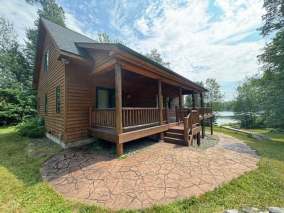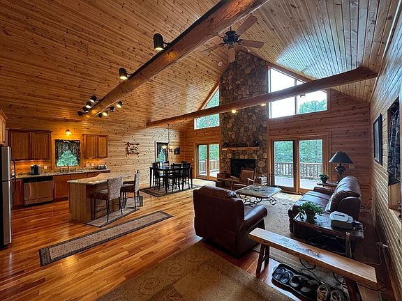 Stunning 4 bedroom, 3 ½ bath custom built home featuring 290 feet of level south facing frontage on Rice Lake! This is a very private park like setting offering over 2 acres of wooded land loaded with towering pines and hardwood trees. The exterior of this chalet style home is wrapped in cedar siding and features a large wrap around waterfront deck, covered porch, log railings and beautiful stone patio and walkways. Inside you’ll find an impressive great room with a towering cathedral wood ceiling, massive stone fireplace, 2 large waterfront patio doors and gourmet kitchen! The spacious master bedroom offers a spectacular master bath complete with a Jacuzzi tub. Upstairs you’ll find a second master suite, while the lower walkout level highlights 2 additional bedrooms, 3rd full bath & fantastic family room with gas fireplace, lakeside patio door & wet bar. All this, plus appliances, most furnishings, riding mower w/ snowblower & pontoon boat are all included! A must see for sure!