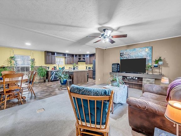 Step inside to discover an open and functional floor plan with a spacious living area, large windows that fill the home with natural light, and a comfortable flow between the kitchen, dining, and living spaces. The kitchen features ample cabinetry, a center island for food prep or casual dining, and easy access to the dining area, making it ideal for both everyday meals and entertaining.